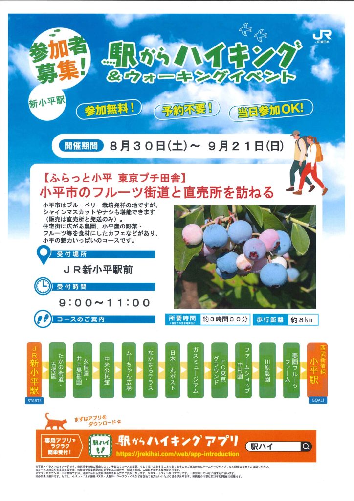 コースは新小平駅→たかの街道・吉澤園→久保園・井上果樹園→中央公民館→ムーちゃん広場→なかまちチテラス→日本一丸ポスト→ガスミュージアム→FC東京グラウンド→ファームショップ中村園→川原農園→美園フルーツ→小平駅です。