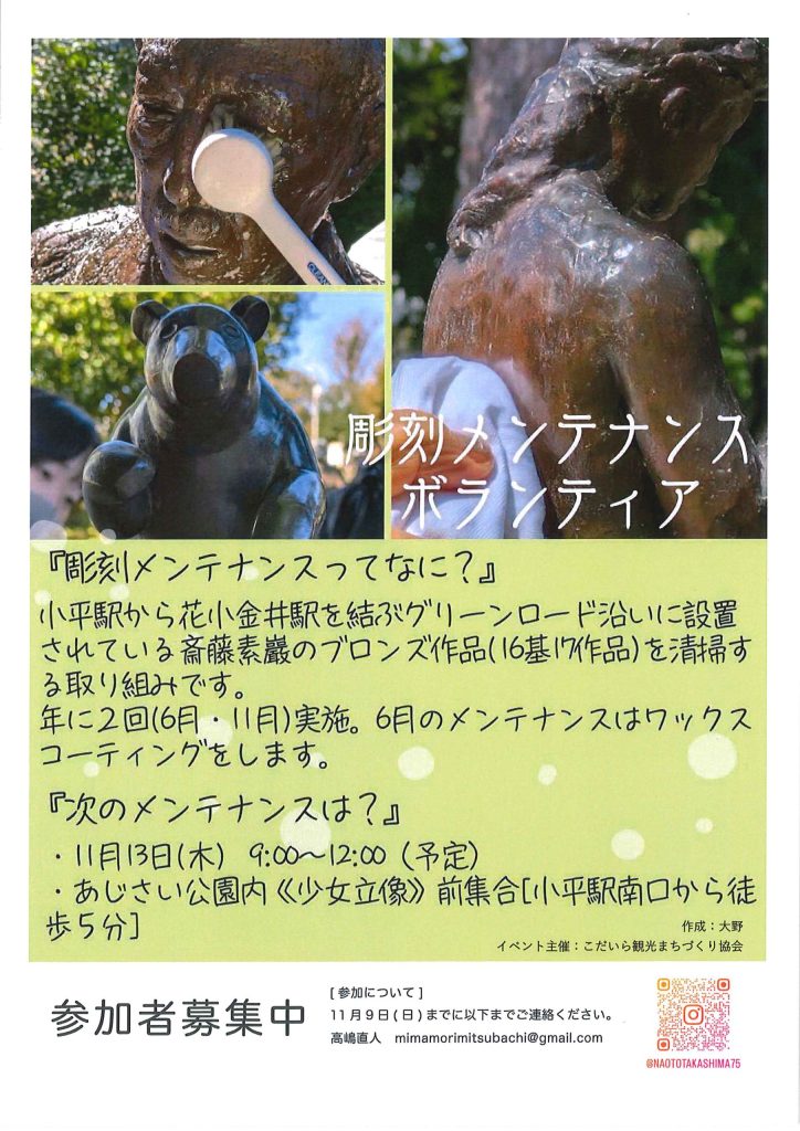 小平駅から花小金井駅間に設置されている齋藤素巖のブロンズ像(16基17作品)を清掃します。