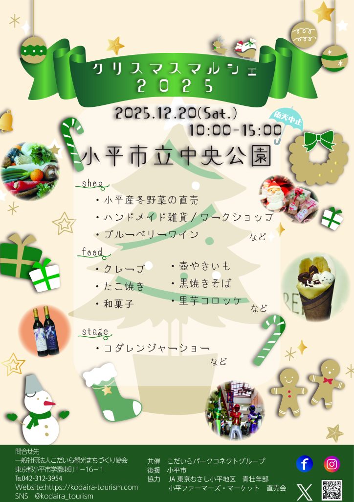 ハンドメイドクリスマス雑貨、小平産冬野菜、ブルーベリー商品、飲食店、ワークショップ、コダレンジャーショーなどなど盛り沢山。