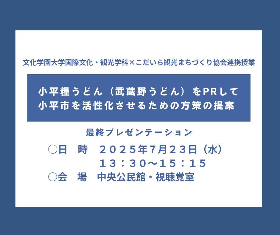 文化学園大学国際文化・観光学科の学生による「小平糧うどん(武蔵野うどん)をPRして小平市を活性化させるための方策の提案」の最終プレゼンテーションを下記のとおり開催しました。
