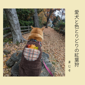 紅葉狩は「紅葉の名所を訪ね歩き、その美を賞すること」と俳句歳時記にあります。しかし名所ではなくとも、近所に紅葉を見に出かけ、楽しむこととしてもいいでしょう。この句は、愛犬と二人で紅葉のいろいろな色の葉を拾って楽しんでいる様子がよく伝わってきます。